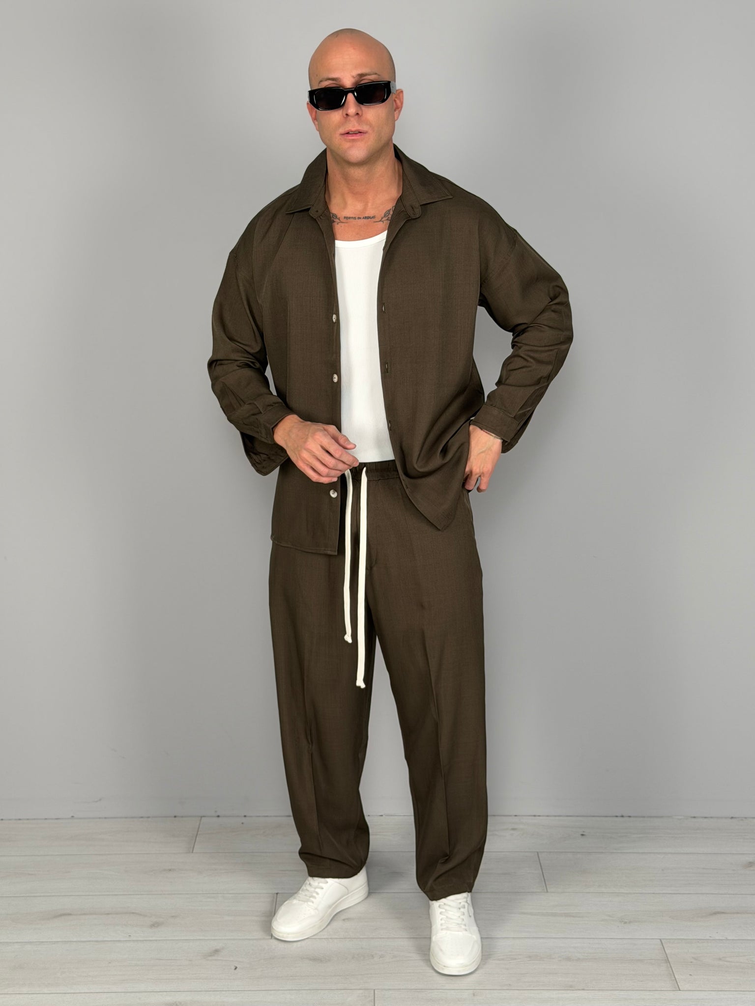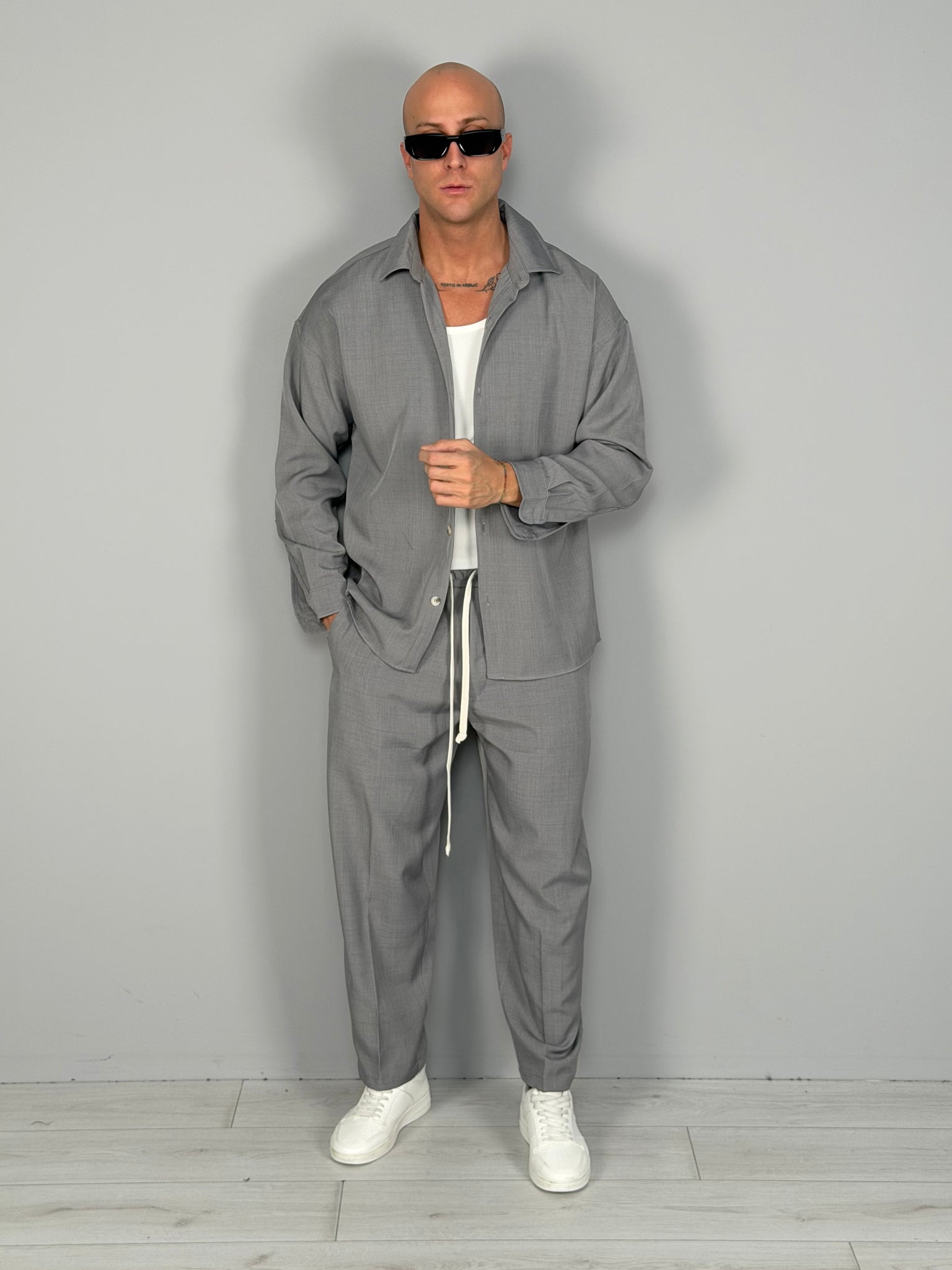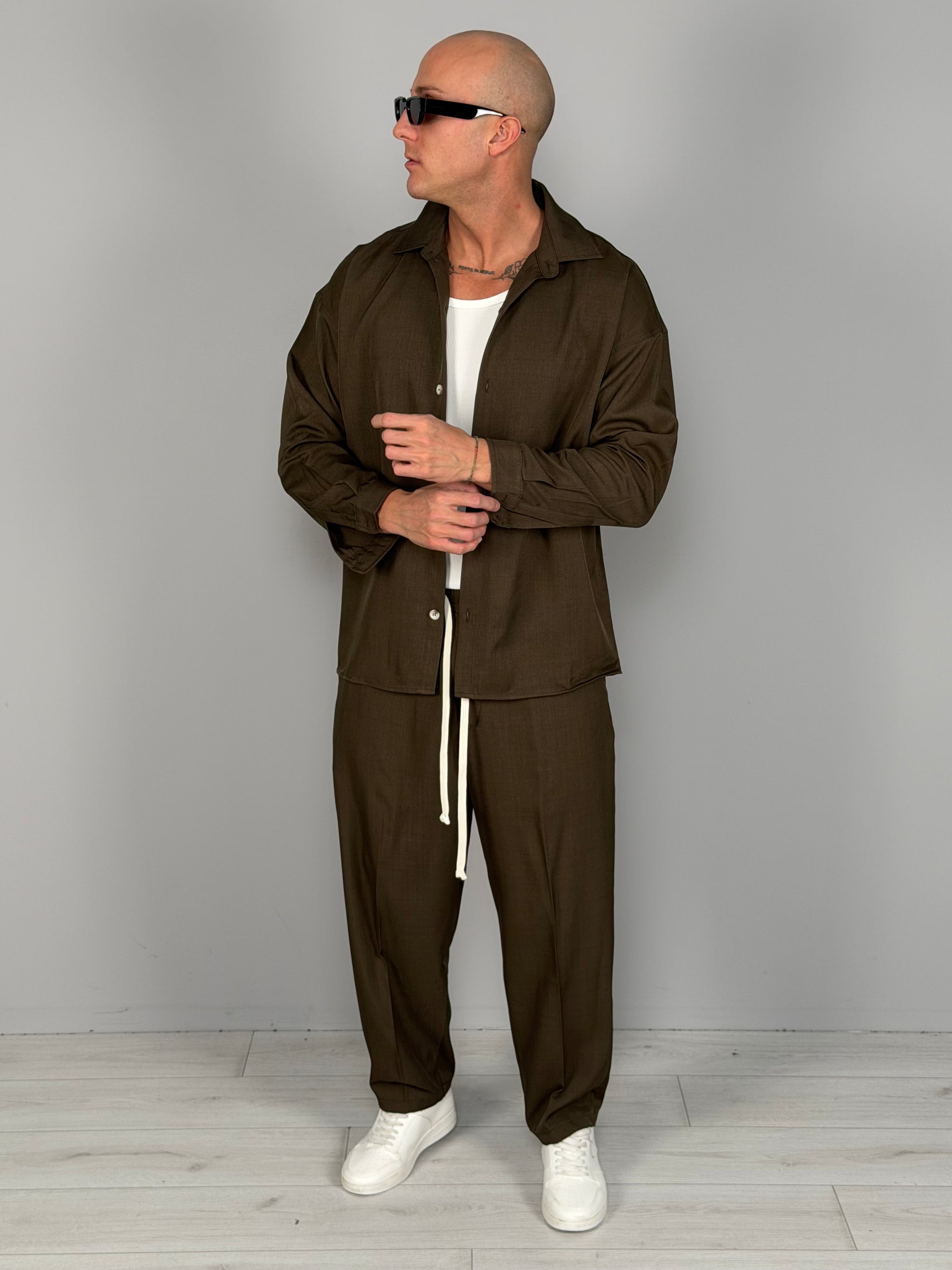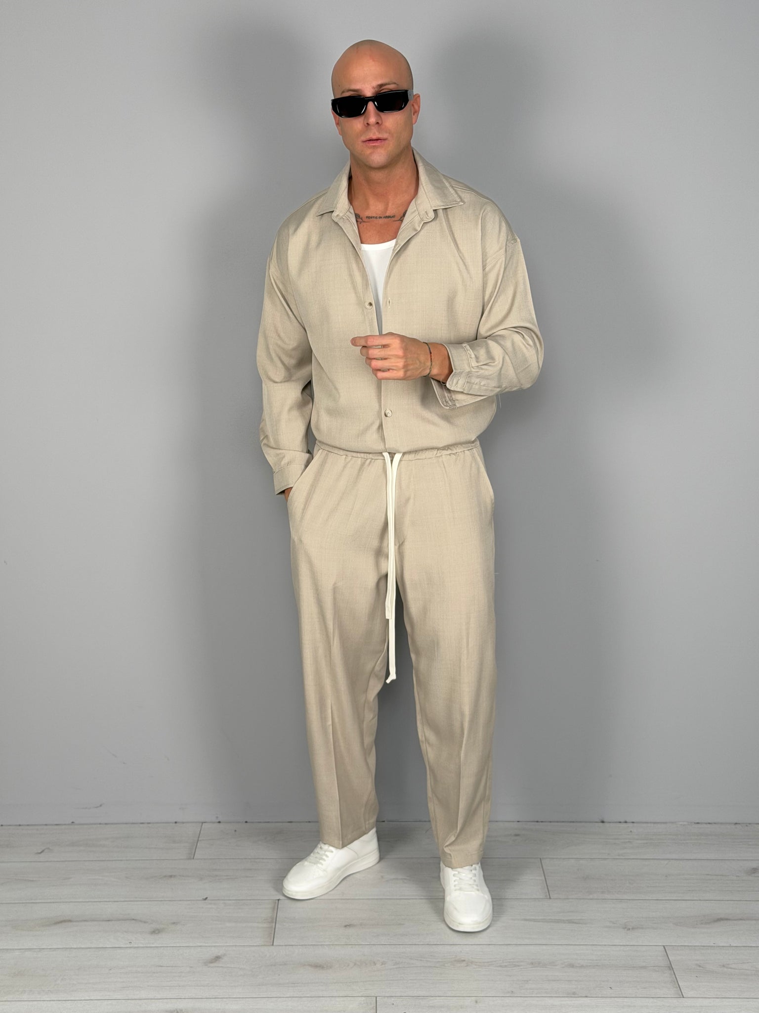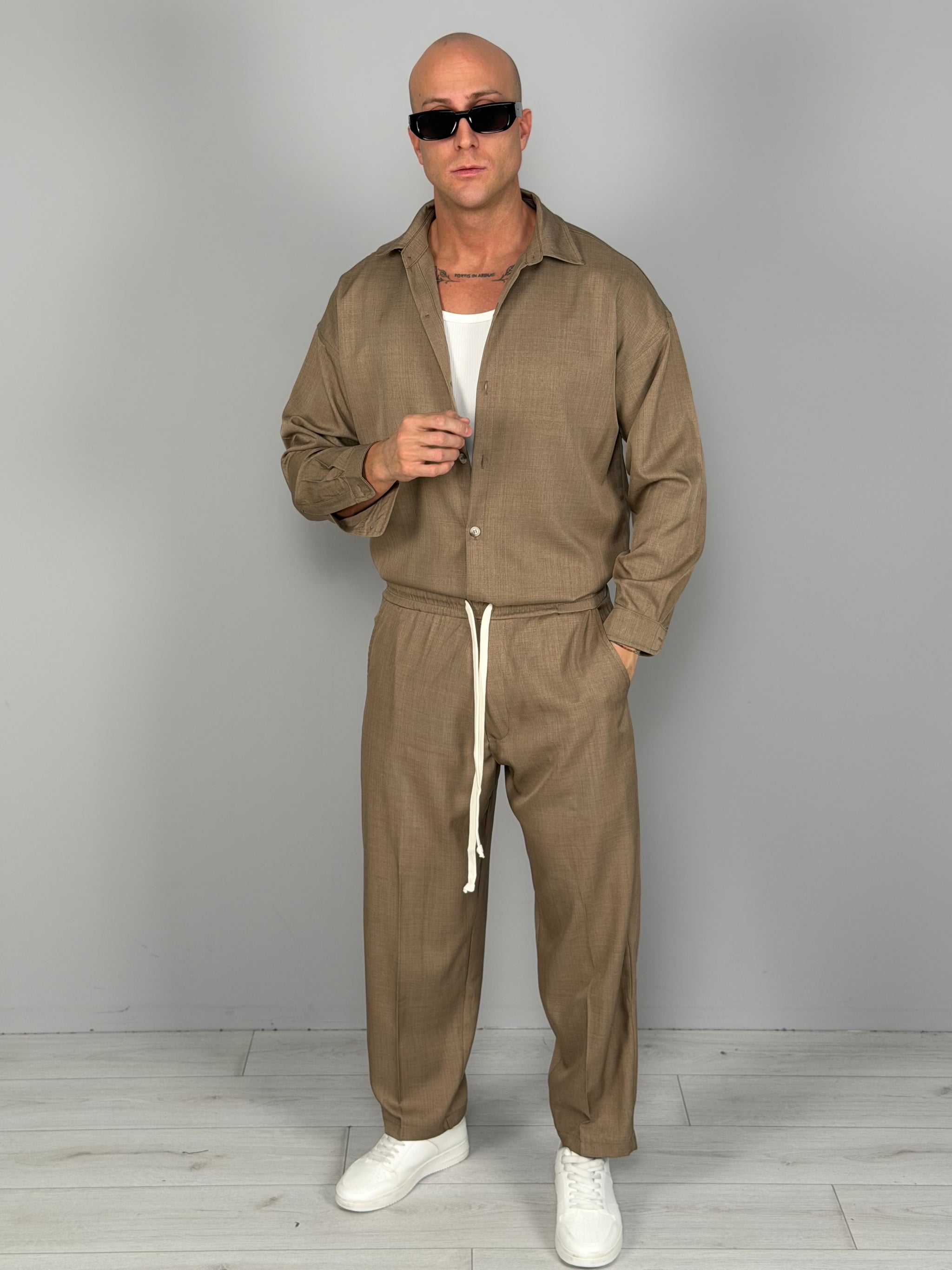 Conjunto de estilo contemporáneo y relajado, compuesto por camisa y pantalón en tejido técnico ligero. El diseño limpio y el ajuste cómodo lo hacen ideal tanto para looks casuales cuidados como para outfits más elaborados. La camisa presenta una línea suave con cierre frontal de botones, mientras que el pantalón se caracteriza por una cintura elástica con cordón ajustable para máxima comodidad.