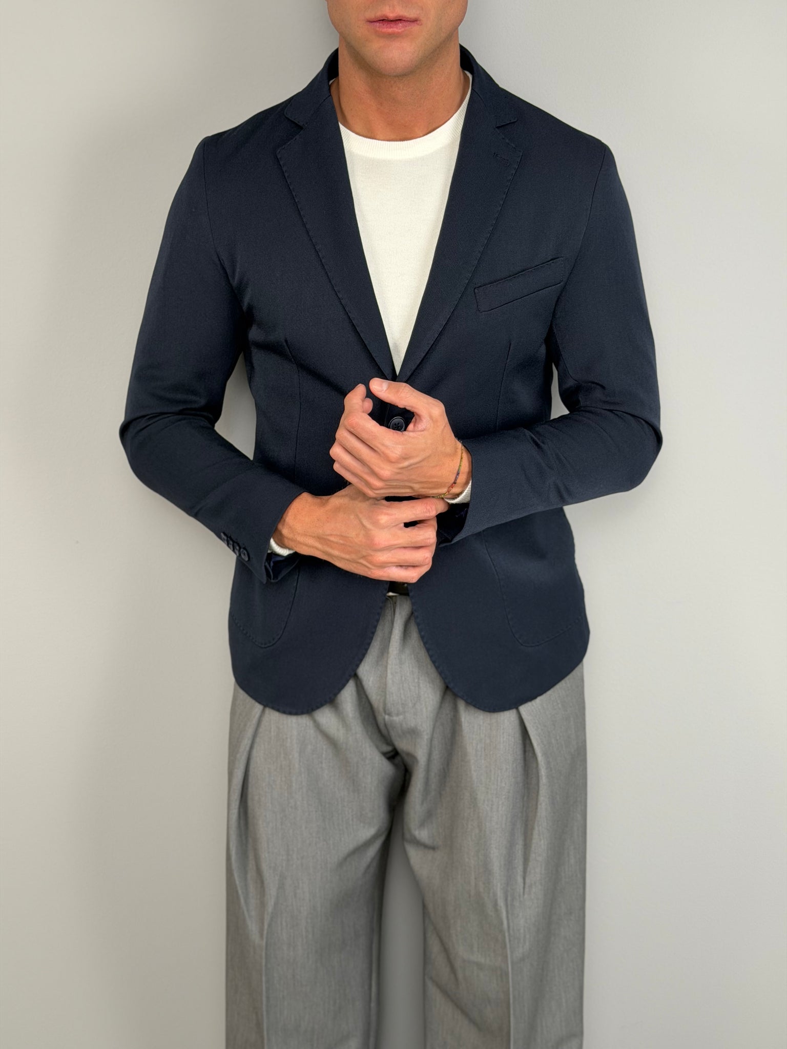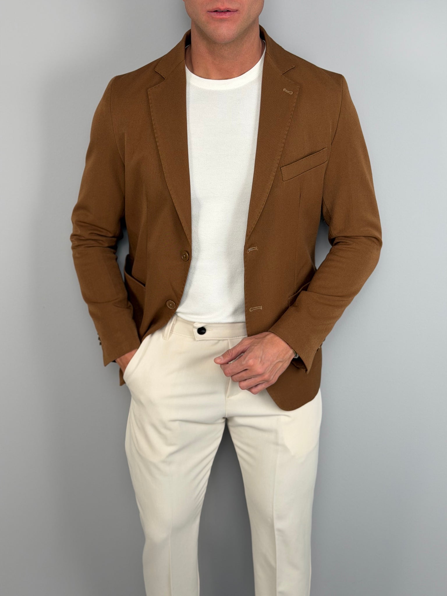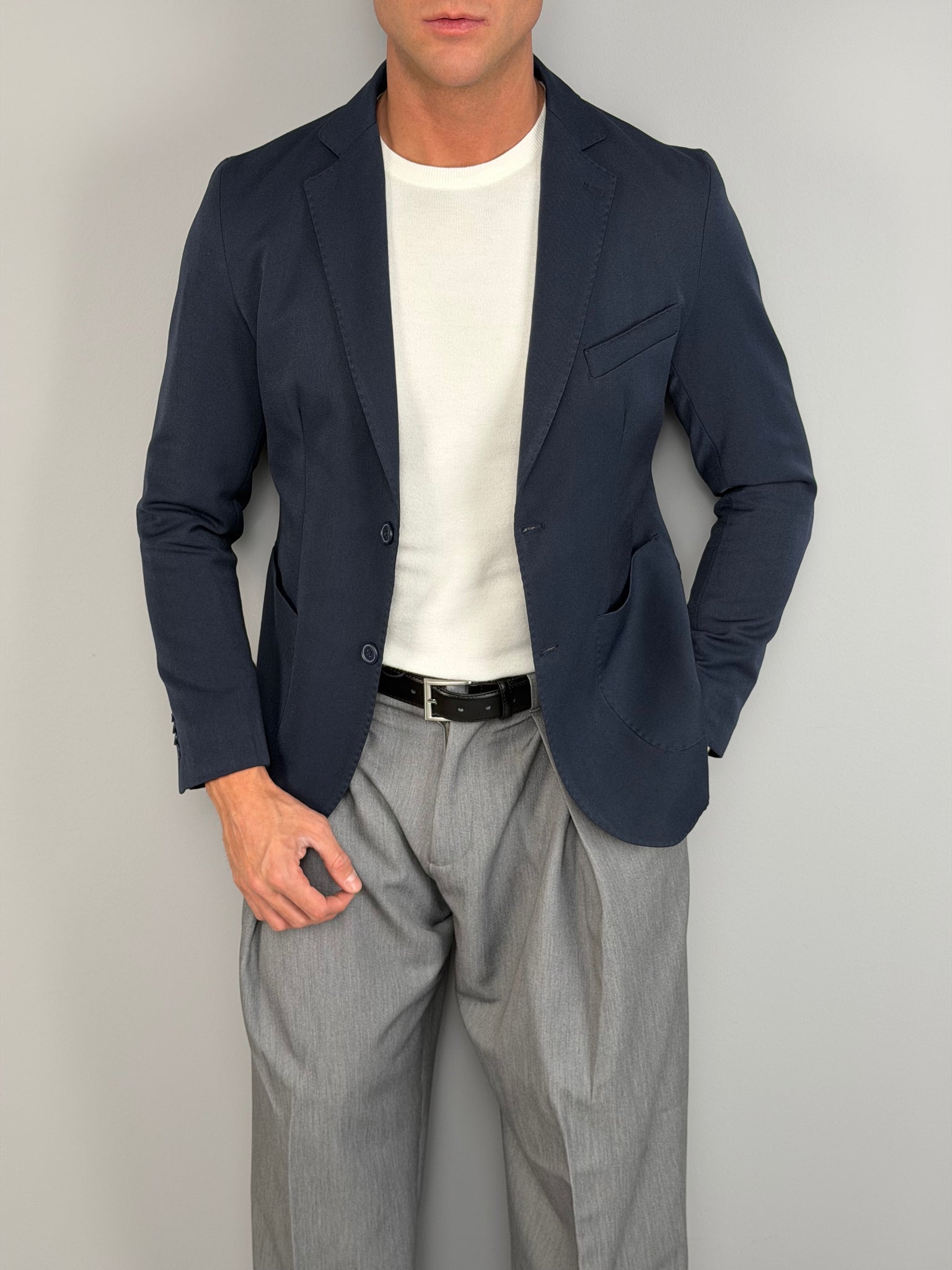 El diseño de un solo botón con solapa clásica y cierre de dos botones ofrece un aire refinado y versátil, ideal tanto para contextos formales como para conjuntos más modernos y smart-casual. Los bolsillos aplicados y el bolsillo en el pecho añaden un toque sastre, mientras que la línea limpia realza cualquier combinación: desde la camisa con corbata hasta la simple camiseta para un look más relajado pero cuidado.