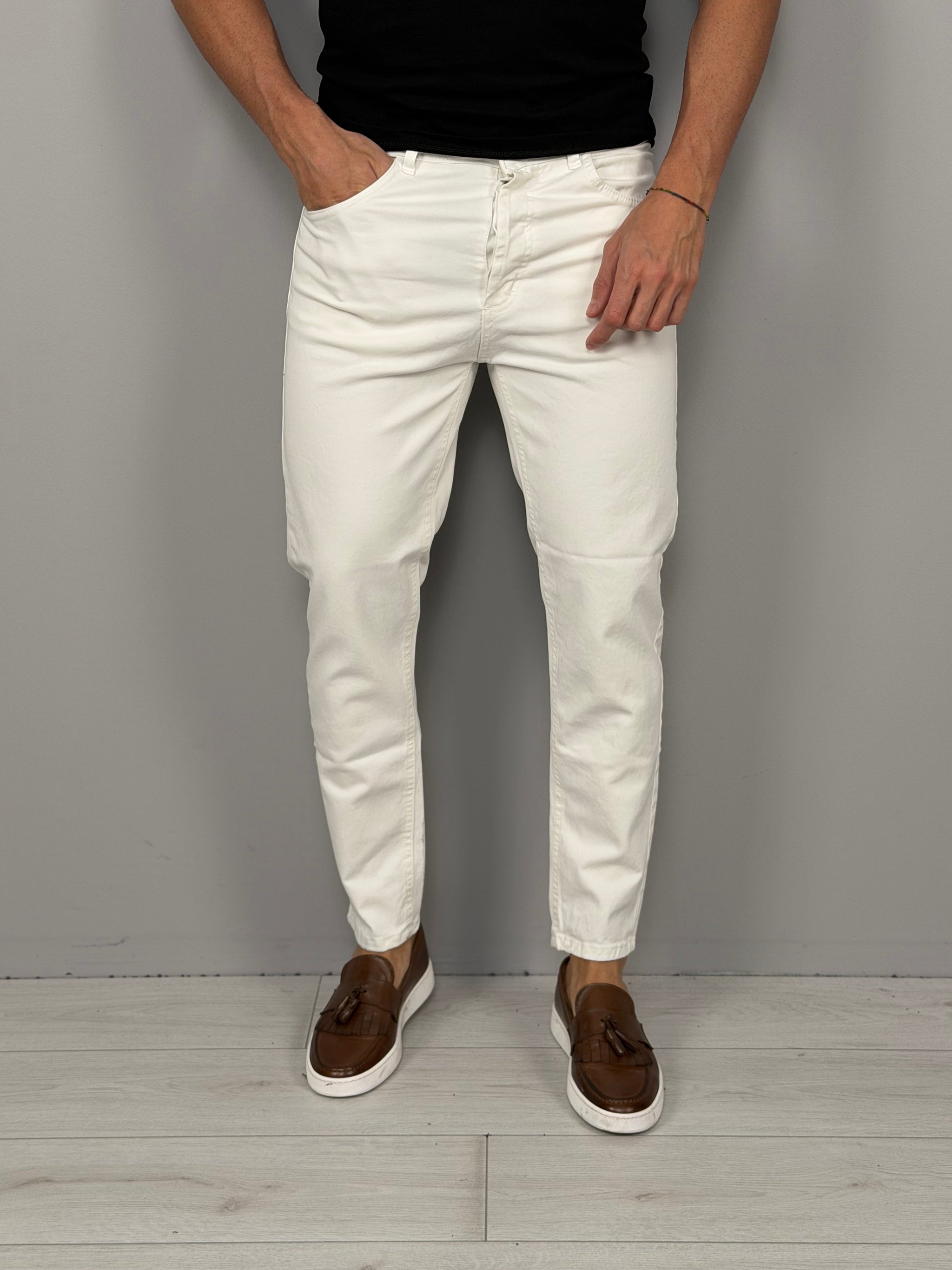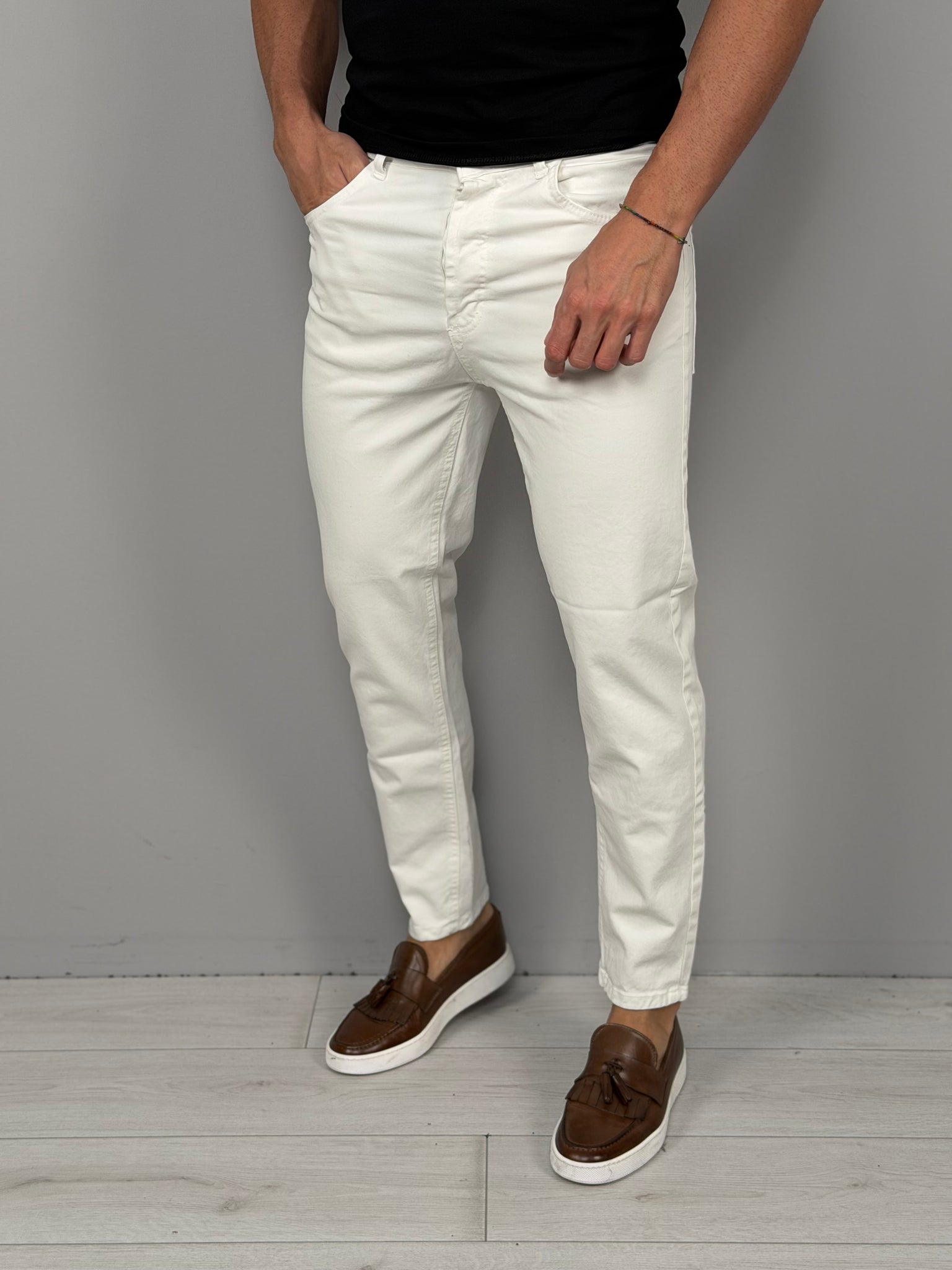 El corte moderno y entallado realza la figura masculina, mientras que los detalles limpios y sencillos hacen que esta prenda sea sumamente versátil: perfecta para combinar con camisas, suéteres o camisetas para un aspecto informal pero cuidado. Los bolsillos laterales y traseros añaden funcionalidad y practicidad sin renunciar a la elegancia.