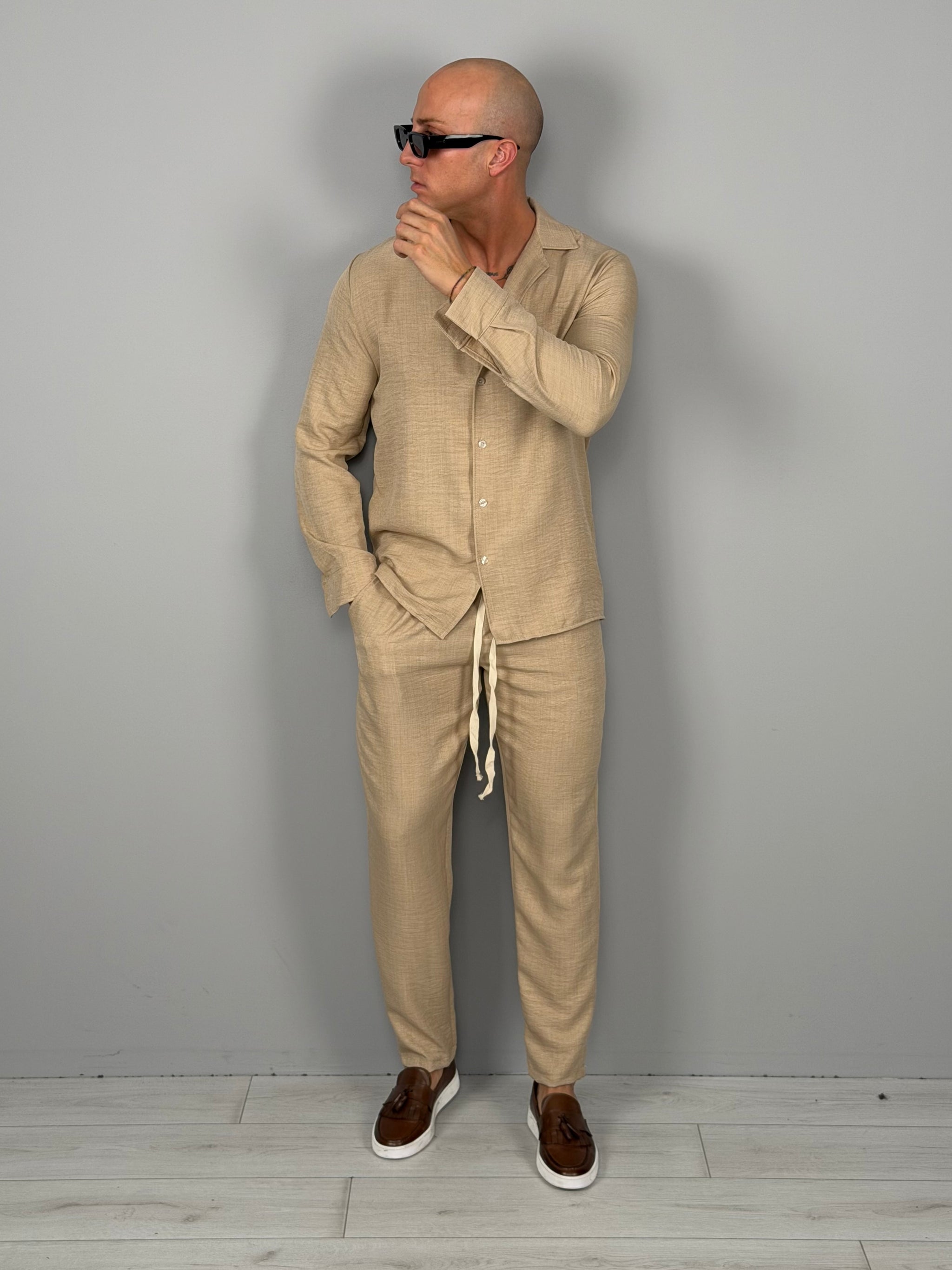 La camicia presenta un design minimal con collo aperto, chiusura frontale con bottoni e linea morbida, ideale da indossare sia aperta che chiusa. Il pantalone coordinato completa il set con una vestibilità rilassata e moderna, perfetta per creare outfit eleganti ma disinvolti.